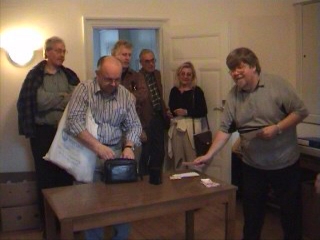 Am Samstag Nachmittag fand die Versteigerung von TI Produkten statt. Berry Harmsen übernahm die Leitung der Auktion und führte sie vorbildlich mit Hammerschlag durch. Dabei wurde auch dieses Jahr, der Tradition verpflichtend, das "letzte" TI Extended Basic Modul versteigert. | ![]() ![]() |