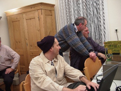Fred Kaal (im Bild siehe rechts) - bekannt durch den DM2k und TI-PC Emulator stand für alle Fragen rund um C99 und TI/PC SW-Entwicklung zur Verfügung. Wolfgang Bertsch (im Bild links) stellt eine neue Version des populären Spieles Tillionaire vor. Tillionaire kann in der neuesten Version von der Festplatte aus gestartet werden und es stehen mehrere verschiedene Wissensdatenbanken zur Verfügung. |