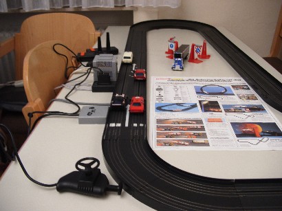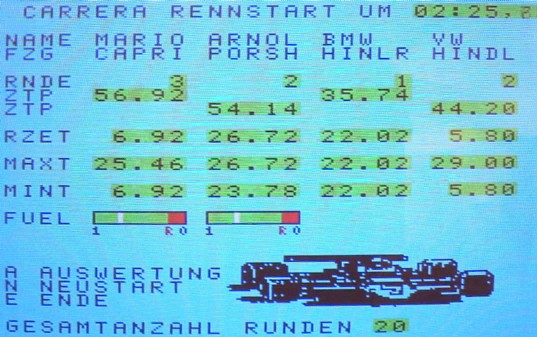 In diesem Zusammenhang wurde von mir auch das erste digitale Tankstellensystem für Carrera Rennbahnen entwickelt. Die SW simuliert eine Tankfüllung pro Rennwagen, die abhängig vom Betätigen des Gaspedals Sprit verbraucht. Wurde das rechtzeitige Nachtanken verpasst, bleibt das Fahrzeug auf der Rennbahn stehen. Erst durch Nachtanken kann das Fahrzeug weiterfahren. Damit lassen sich strategische Rennen fahren wie sie z.B. Michael Schuhmacher durch Optimierung der Boxenstops erreichte. |