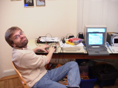der Playstation one. Auf seinem Tisch befand sich auch ein ein TM990/189 Entwicklungsboard. Zusammen mit Fred Kaal teste er seine neue IDE Karte. |
